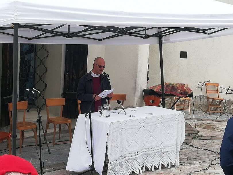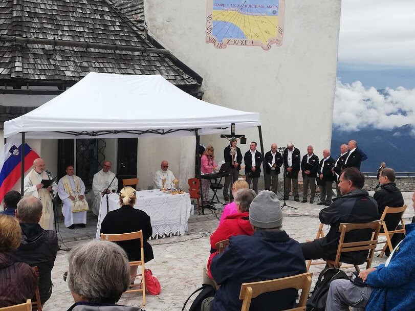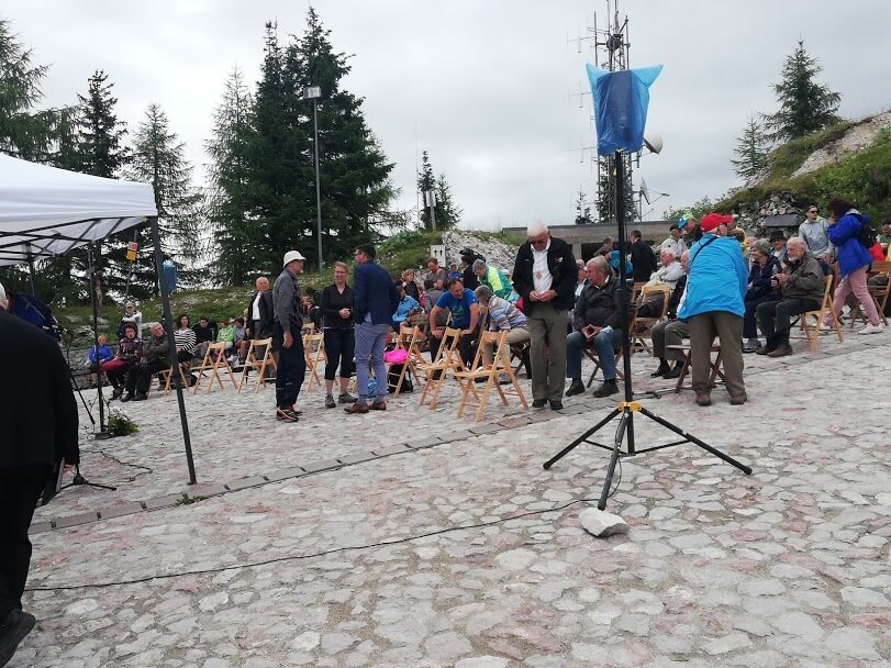 Veliko tistih, ki smo kolikor toliko redni udeleženci romanja, se nas že pozna, tako da se veselo pozdravimo – že pred žičnico, vsekakor pa, ko pridemo do prireditvenega prostora za cerkvijo.