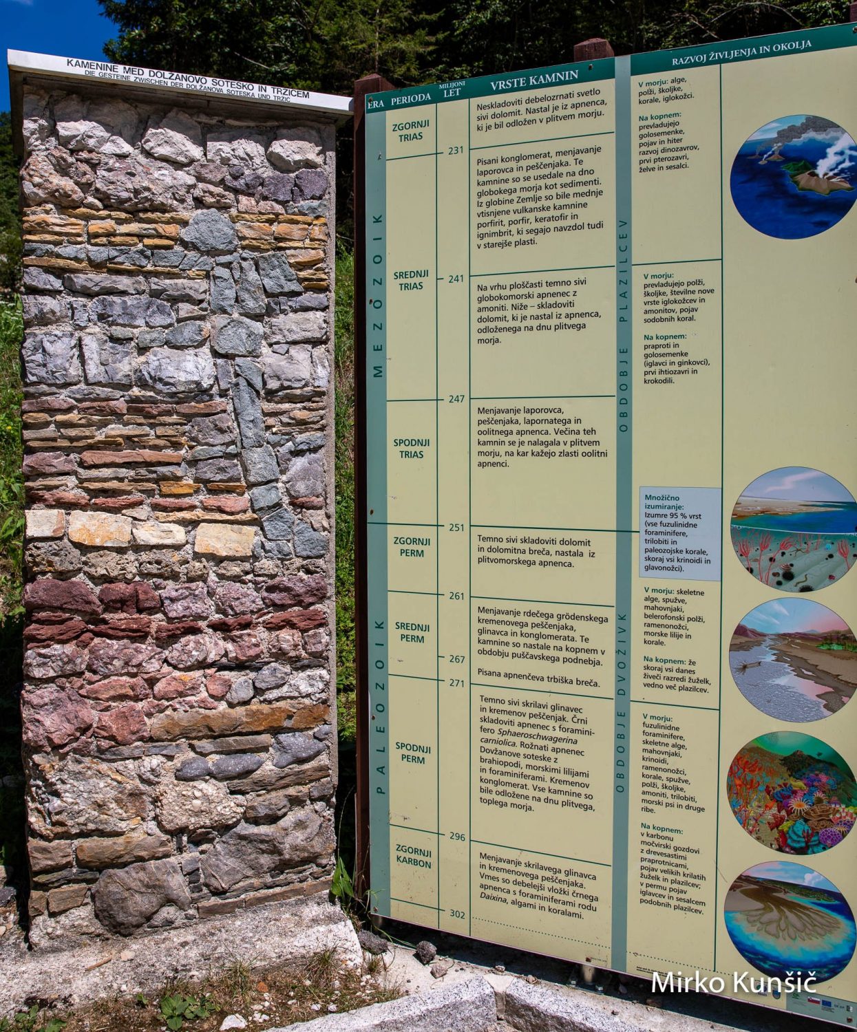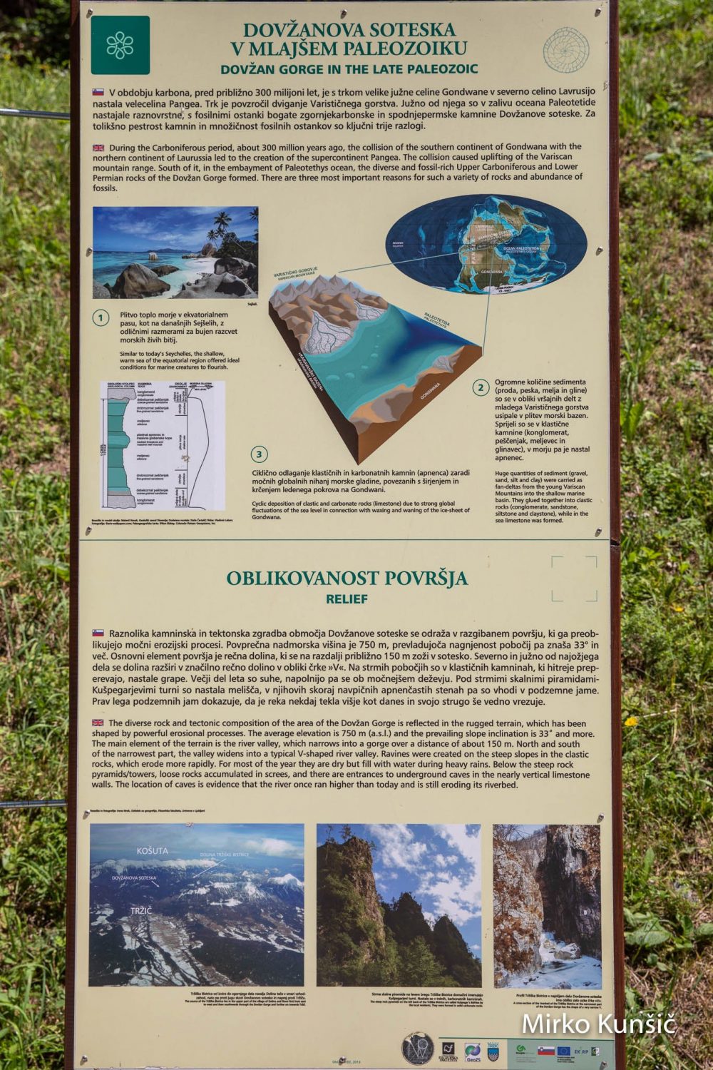 Tudi v tej suši je Tržiška Bistrica v Dovžanovi soteski še šumeča, ne tako obilna kot takrat, ko seže gladina domala do roba mostu in ko slišiš v strugi ječanje, drgnjenje in kotaljenje kamnin. Tam se že milijone let brusijo rožnati apnenec, bogat z lilijami, brahniopodi in foraminiferani, algami, koralami. V nedrjih so ostanki morskih psov, ramenonožcev, školjk in rib. Lepi so rdeči groedenski kremenovi peščenjaki, črni skladovit in drugi.