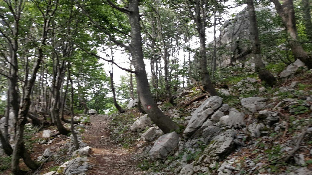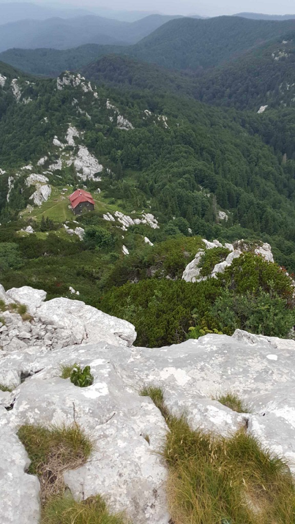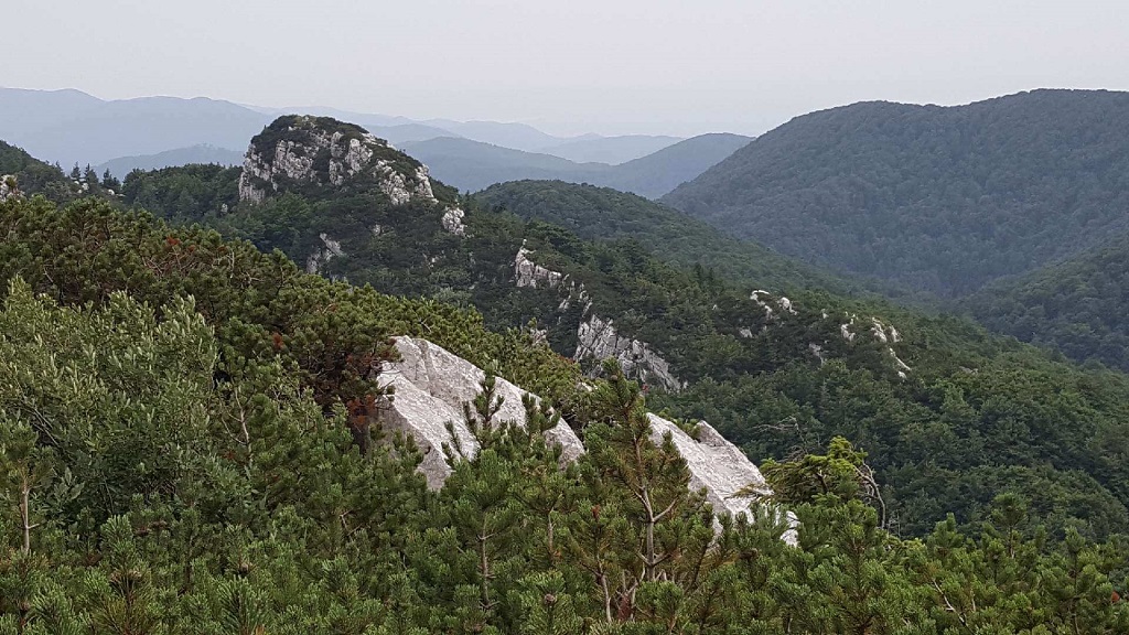 Prav kmalu pa nas je čakal še zadnji podvig, ki je pred nami razgrnil alpskemu na las podoben svet: poslednje drevje, ruševje in skalovje. Na enem ali dveh mestih je bila tudi kovinska vrv za oprijemanje. Na vrhu pa sijajen razgled, navkljub nekoliko oblačnemu vremenu. Znašli smo se v objemu hribovitega, gozdnatega, čarokrasnega prostranstva Gorskega kotarja. In tam v daljavi je bilo Lokvarsko jezero, Reško primorje pa Snežnik in še kakšna, po vrhu gola planota z oddajnikom, podobna Nanosu. In ob vsej tej razkošni, obilni paši za oči še silovit veter, ki mi je iz rok domala iztrgal telefon ter na vsak način skušal preprečiti, da bi to prečudovito panoramo v neponovljivem trenutku ovekovečil na fotografijah