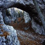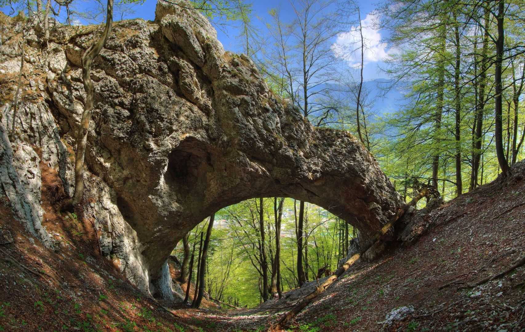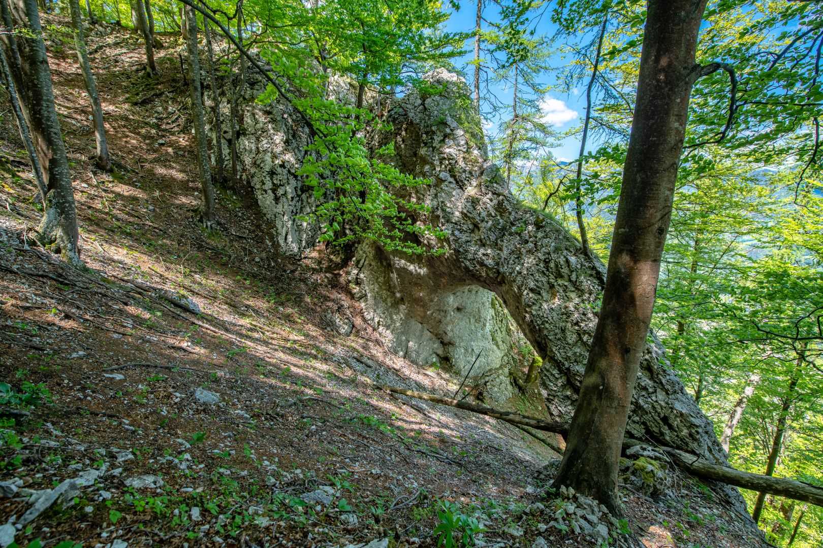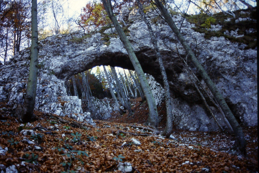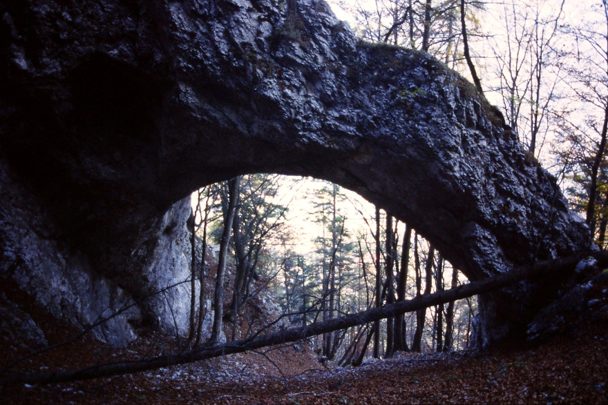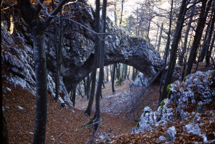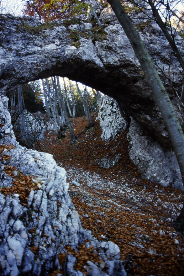 Mežakla je dolg greben z višino kakih 1200 metrov, ki ga na eni strani omejuje dolina Save Dolinke, na drugi strani pa dolina reke Radovne. Naš potep začnemo v vasi Kočna na ovinkasti cesti med Jesenicami in Bledom. Po dveh urah hoda sredi grebena najdemo osupljivi skalni lok. Ostanek nekdanje kraške jame. Po moji oceni je naravno okno dimenzij kakih 8×15 metrov. Na eni strani se skalne stene dotika bolj “na rahlo”. Na drugi strani skalni lok deluje še trdno.