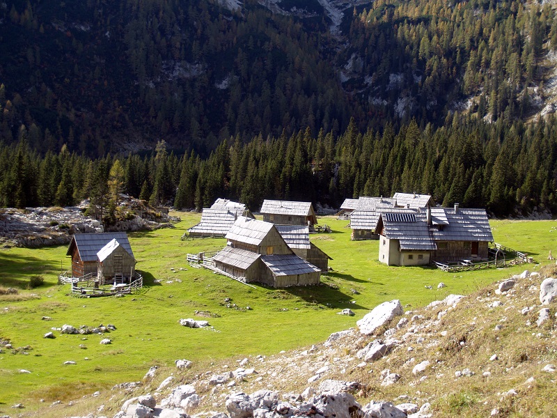 Na poti proti planini Jezero že po nekaj minutah zavijemo ostro desno in po uri in pol hoda smo na planini V lazu. Prava idila. Planšarije, sirarna, potoček, travnik, obdan z gorami.