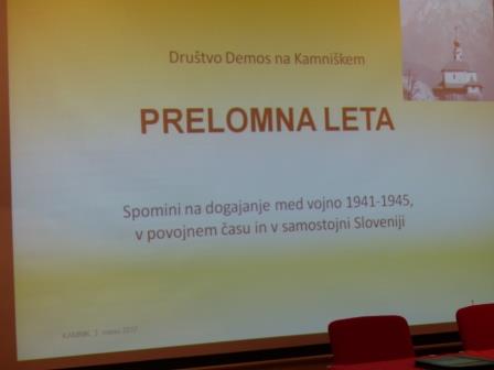 V petek, 3. marca 2017, smo se odzvali vabilu članov Društva Demos na Kamniškem in Društva sv. Jakob iz Kamnika, ki so v dvorani Frančiškanskega samostana Kamnik pripravili predstavitev knjižne novitete z naslovom Prelomna leta. Gre z zbornik pričevanj o dogodkih med drugo svetovno vojno, ob koncu vojne in v letih po njenem koncu.