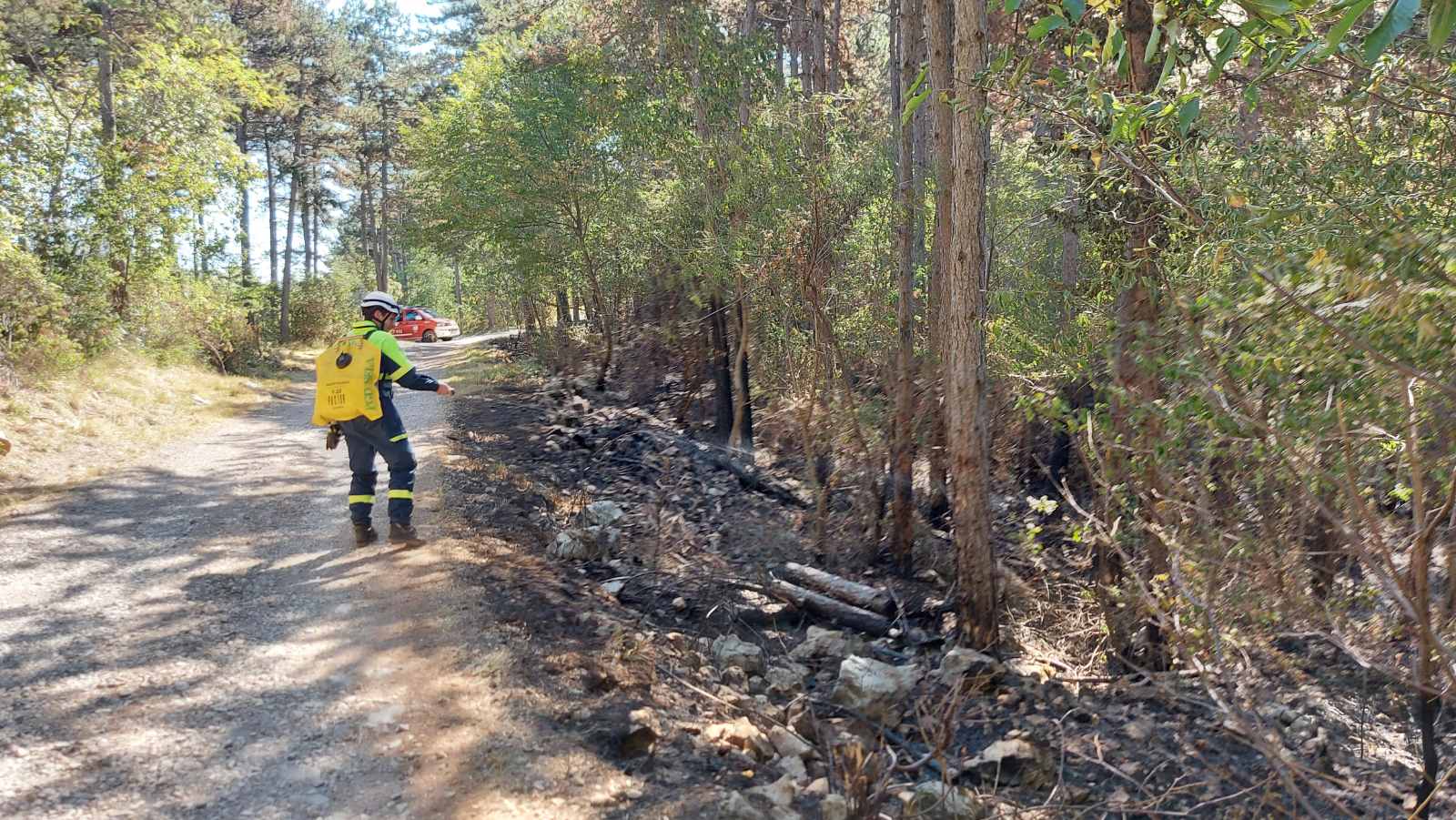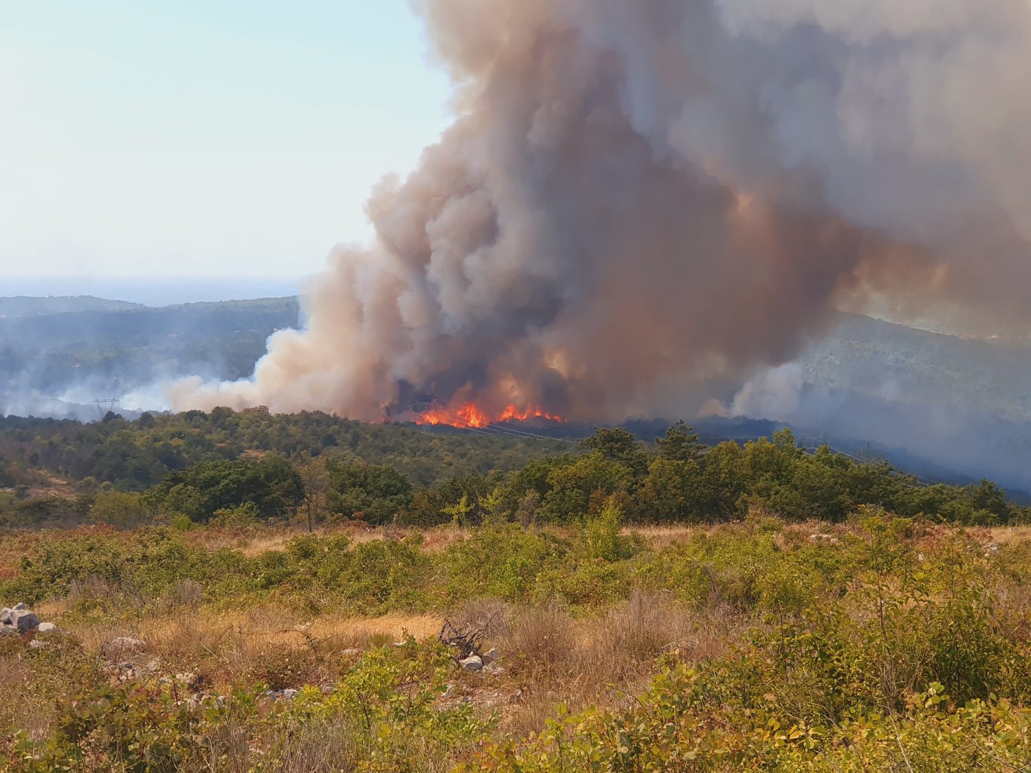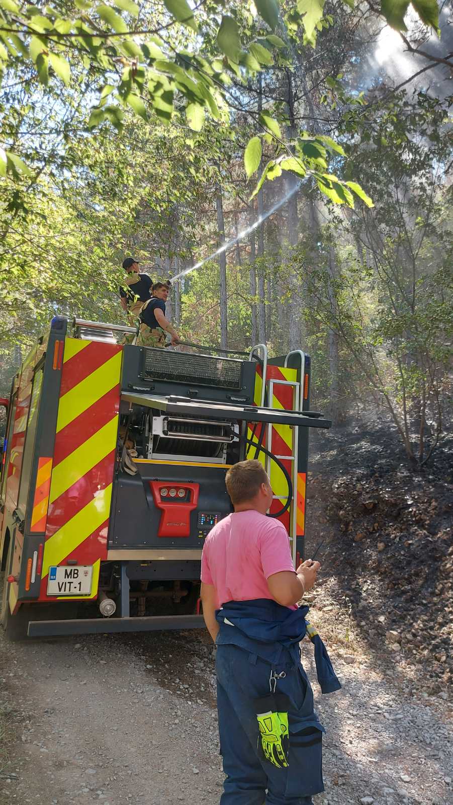 Nekateri z metlami, dva za cevjo, čisto izmučena. Domačin, izkušen iz preteklosti in poznavalec terena, opozori, da se bo treba umakniti. Ogenj nas zajema. Res so z leve strani plameni visoki, višji od povprečnega stropa. Poskušamo s podiranjem dreves, ne bomo tako hitri, tudi vode ni več dovolj. Vodja ukaže zapustitev območja. Izčrpani vlečemo cevi po »minskem polju«, kot ga imenuje domačin. Na tem območju naj bi bilo veliko neeksplodiranih sredstev. Verjamem mu, teren bolje pozna kot mi. Po ozkih poteh se z mišjimi koraki vračamo nazaj. Pridružim se Novi Gorici, imata še en prostor.